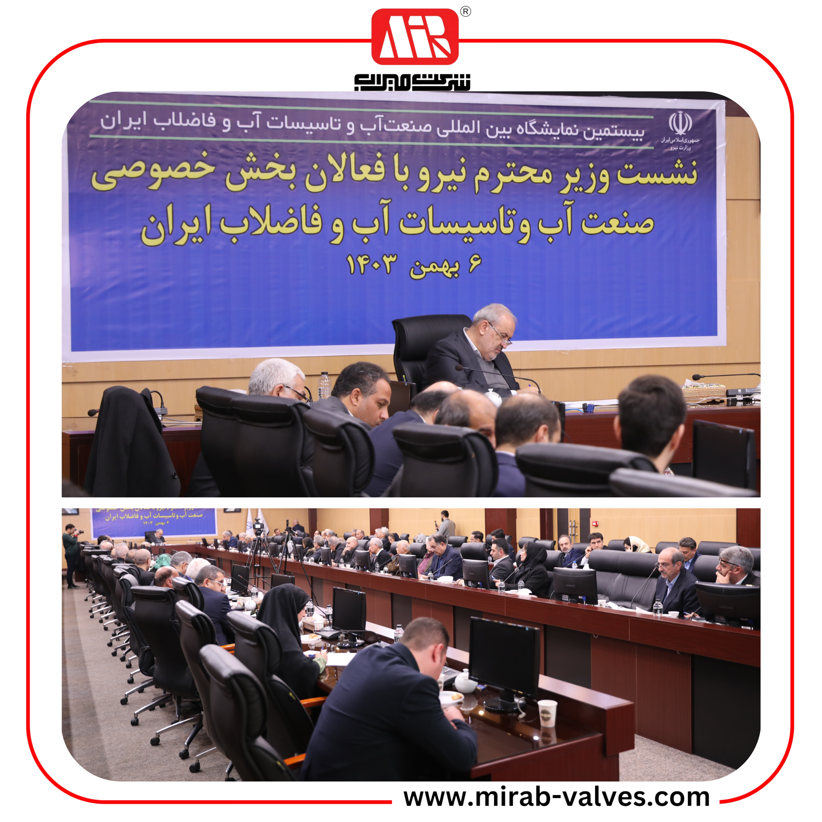 در بیستمین نمایشگاه بینالمللی آب و فاضلاب تهران، نشست صمیمانهای با حضور وزیر محترم نیرو، جناب آقای دکتر علی آبادی، و فعالان بخش خصوصی در صنعت آب و فاضلاب کشور برگزار شد. در این نشست، تولیدکنندگان و فعالان حوزه آب و فاضلاب به بیان موضوعات و مسائل مختلف در حوزه آب و فاضلاب و ارائه راهکار و پیشنهادات در جهت رفع مشکلات در این صنعت پرداختند.