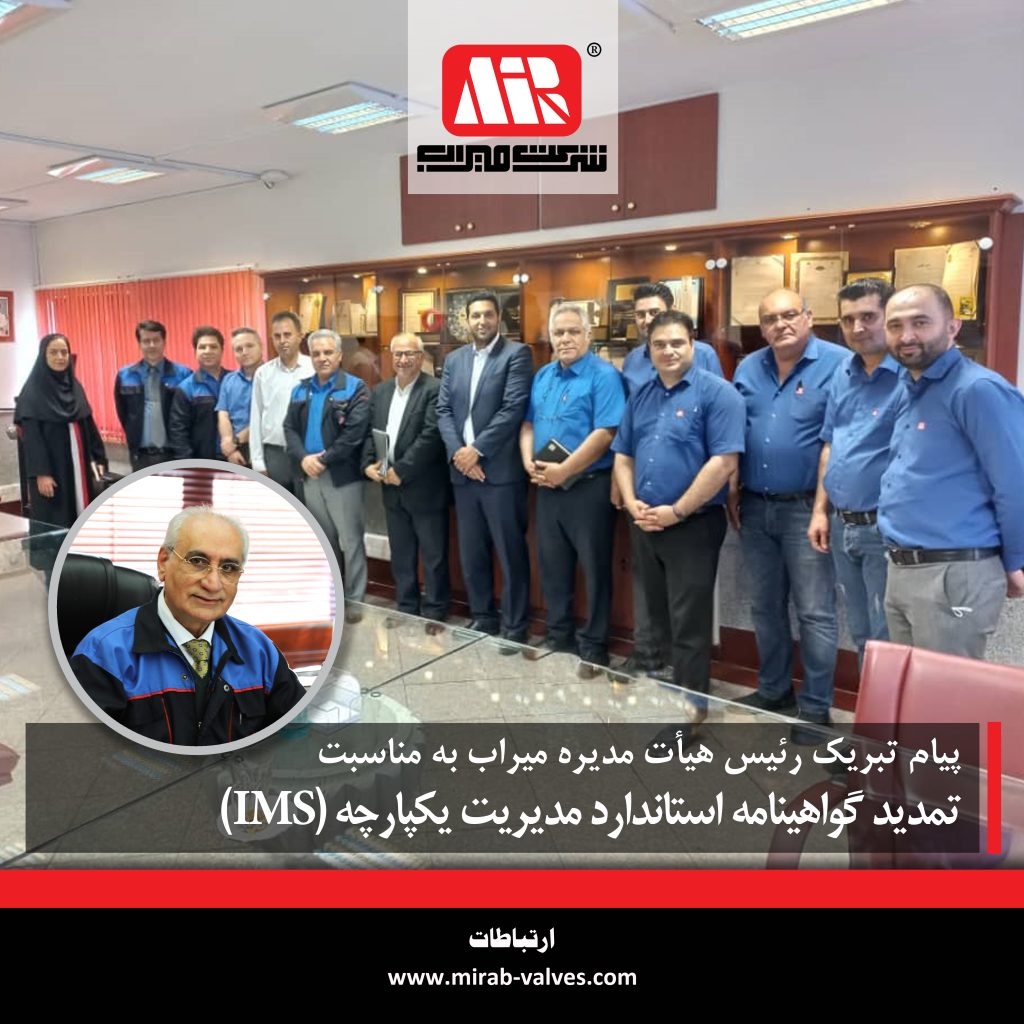 پیام تبریک رئیس هیأت مدیره میراب به مناسبت تمدید گواهینامه استاندارد مدیریت یکپارچه (IMS) برای چندمین سال