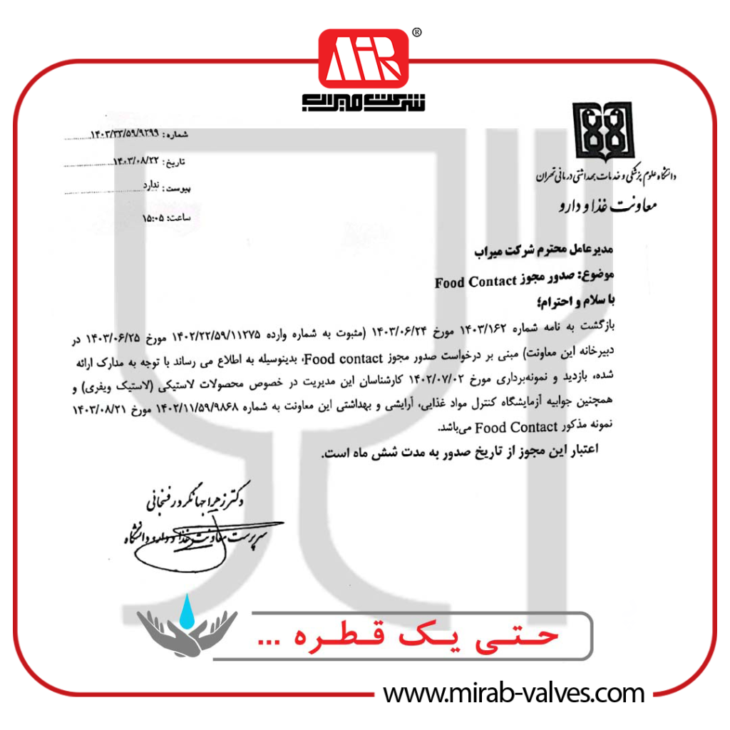 دریافت مجوز Contact Food توسط شرکت میراب
